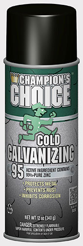Cold Galvanizing 95 is a complete zinc metal spray which rustproofs any metal surface with thorough protection that lasts for years. It is equivalent to a hot galvanizing treatment as it fuses and adheres to all metal surfaces, stopping corrosion immediately. Zinc used in this product is 95% pure. Coated surfaces can be welded safely without fire or fumes. Resistant to abrasion, cracking or peeling, and oxidation. Heat resistant up to 400°F. Does not contain lead.