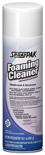 SprayPAK® Foaming Cleaner is a germicidal that kills Staphylococcus aureus, Salmonella Enterica, Pseudomonas aeruginosa, Escherichia coli, Campylobacter jejuni and Salmonella schottmuelleri as well as Trichophyton interdigitale (athlete’s foot) fungi. Also kill Influenza A Virus H2N2, strain A/Japan/305/57, ATCC VR-100, Influenza B Virus (Hong Kong); ATCC VR-823, Herpes Simplex Virus Type 1 and Type 2, Respiratory Syncytial, and HIV-1 (AIDS) Virus on hard, nonporous inanimate surfaces. Removes mold and mildew stains and odors.