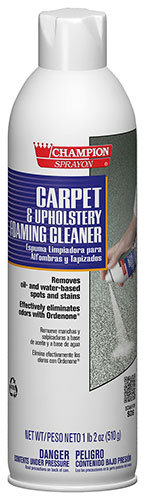 Champion Sprayon® Carpet & Upholstery Foaming Cleaner removes oil- and water-based spills, spots and stains from carpets and upholstery fabrics. Use on a regular basis to prevent stains from setting, and as a pre-spotter prior to extraction.
