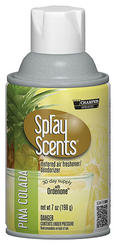 Champion Sprayon® SprayScents® completely eliminate unpleasant odors and leave a clean, fresh scent in the air. Contains Ordenone™, a deodorizing ingredient that is an effective odor eliminator. The measured spray deodorizes up to 6,000 cubic feet. Universal spray tip - our metered air fresheners are manufactured with a universal actuator tip and will fit most metered-aerosol dispensers.